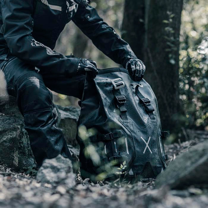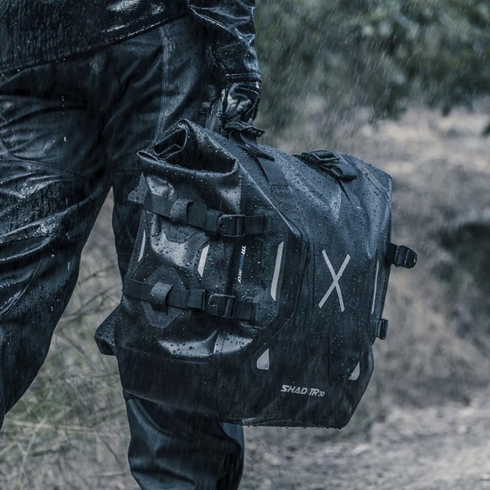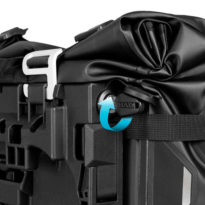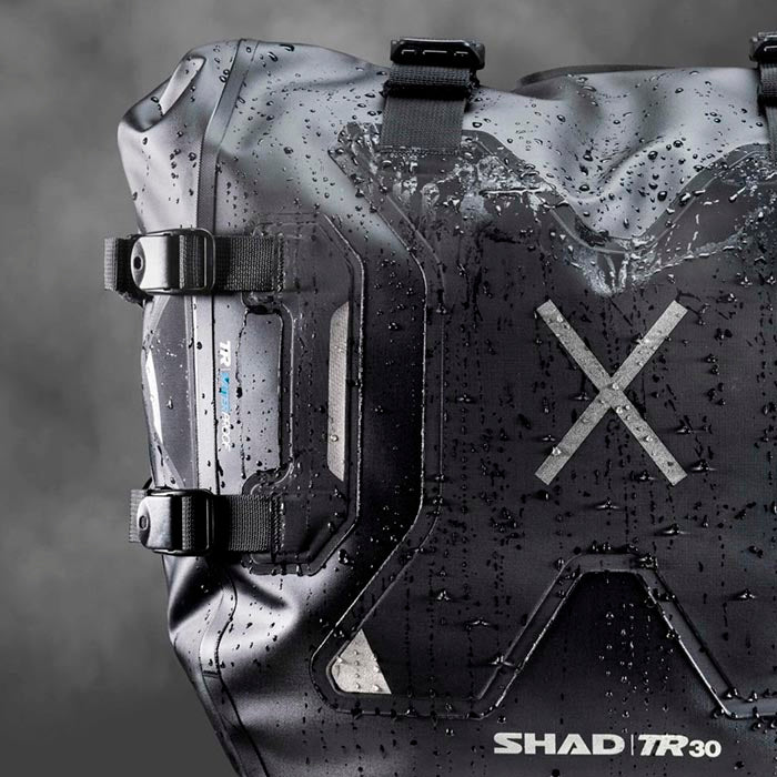 Conjunto Alforjas laterales Shad Terra TR30. Conjunto de alforjas laterales con capacidad de 30 litros cada una y soportan hasta 6 kg de carga. Destacan por su impermeabilidad certificada con un grado IPX6 y un innovador sistema de cierre de doble seguridad, que permite bloquearlas a la fijación de la moto y, a la vez, restringir el acceso a su interior. Compatibles con los sistemas de fijación 3P y 4P, y están fabricadas con materiales resistentes y duraderos, como poliéster y TPU Hypalon.