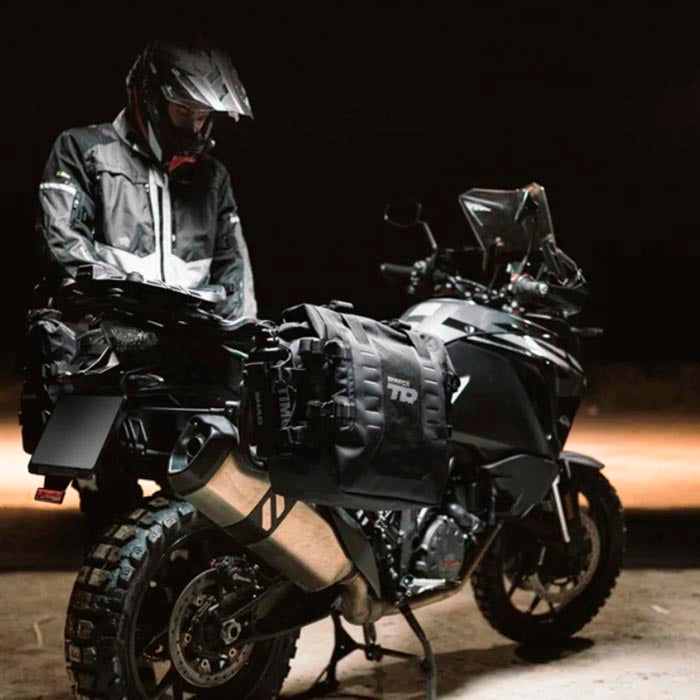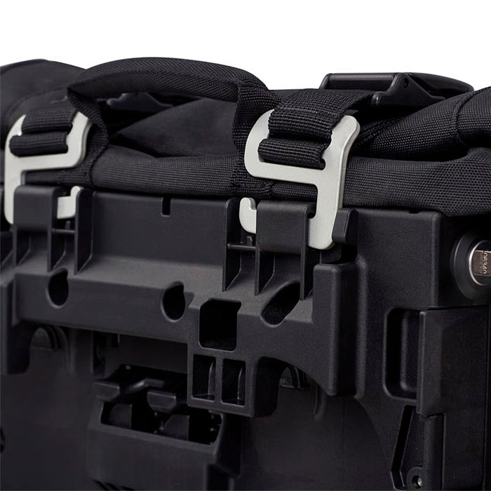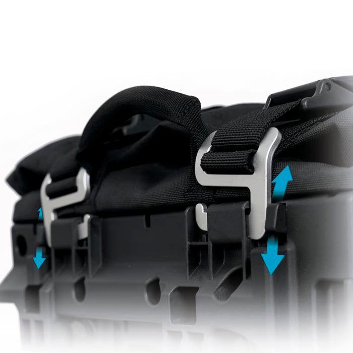 - El conjunto de bolsas laterales cuenta con 6 hebillas Duraflex para ajustar la bolsa al tamaño de la carga y mejorar la estabilidad en conducción.