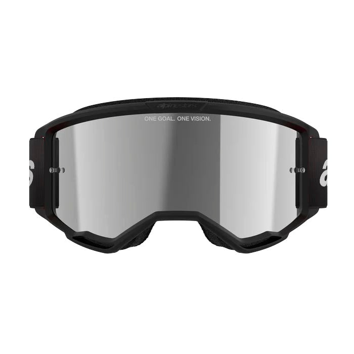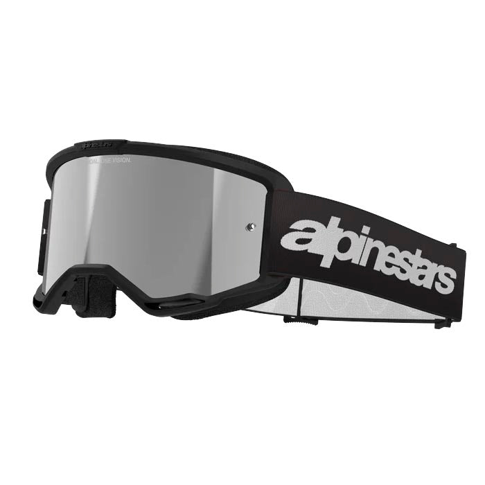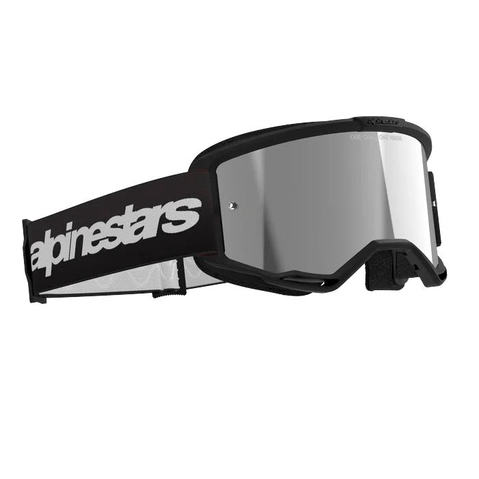Antiparras Alpinestars Vision 3 Wordmark Negro / Lentes Plateado Espejo. Gafas de uso off-road que proporcionan una gran visibilidad periférica gracias a su lente Ultrawide. Su estructura de alta resistencia con tecnología de canalización de la humedad evita la acumulación del sudor y su sistema RAM-Air proporciona un flujo constante de aire. Cuenta con una espuma facial EO15 multicapa de 17mm y una correa ancha de 45mm que evita el deslizamiento.