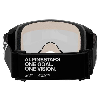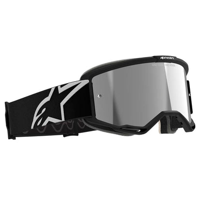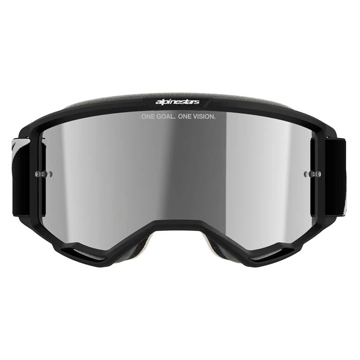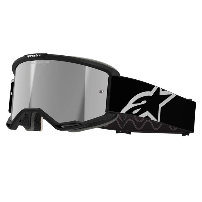 Gafas Alpinestars Vision 5 Corp Negro / Lente Plateada Espejo. Gafas ideales para la práctica de motocross/enduro que proporcionan una gran visibilidad periférica gracias a su lente Ultrawide. Estructura de alta resistencia con tecnología de canalización de la humedad para evitar el sudor y un sistema RAM-Air que proporciona un flujo constante. Cuenta con una espuma facial de 17mm y una correa ancha de 45mm que evita el deslizamiento.