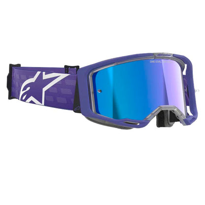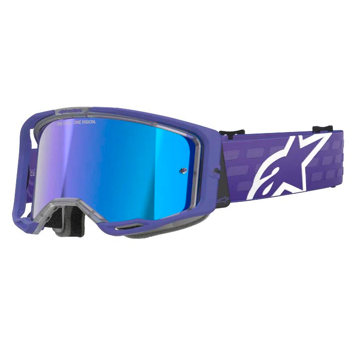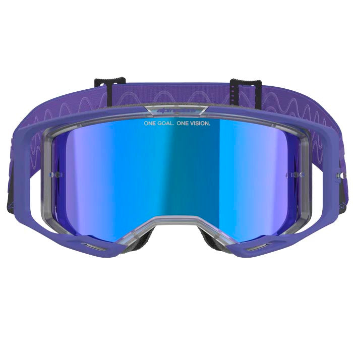 Gafas Alpinestars Vision 8 Corp Lila / Lente Azul Espejo. Gafas de uso off-road que proporcionan una gran visibilidad periférica gracias a su lente Ultrawide. Estructura de alta resistencia con tecnología de canalización de la humedad para evitar el sudor y un sistema RAM-Air que proporciona un flujo constante. Cuenta con una espuma facial de 17mm y una correa ancha de 45mm que evita el deslizamiento.
