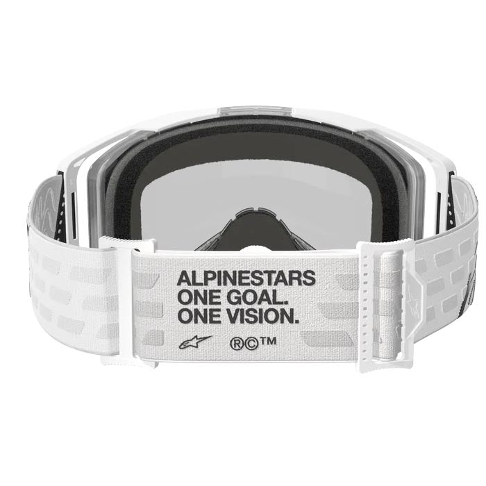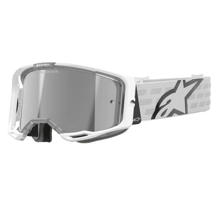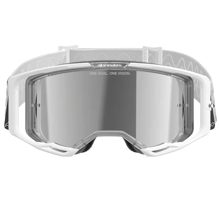 Gafas Alpinestars Vision 8 Corp Blanco / Lente Plateado Espejo. Gafas de uso off-road que proporcionan una gran visibilidad periférica gracias a su lente Ultrawide. Estructura de alta resistencia con tecnología de canalización de la humedad para evitar el sudor y un sistema RAM-Air que proporciona un flujo constante. Cuenta con una espuma facial de 17mm y una correa ancha de 45mm que evita el deslizamiento.