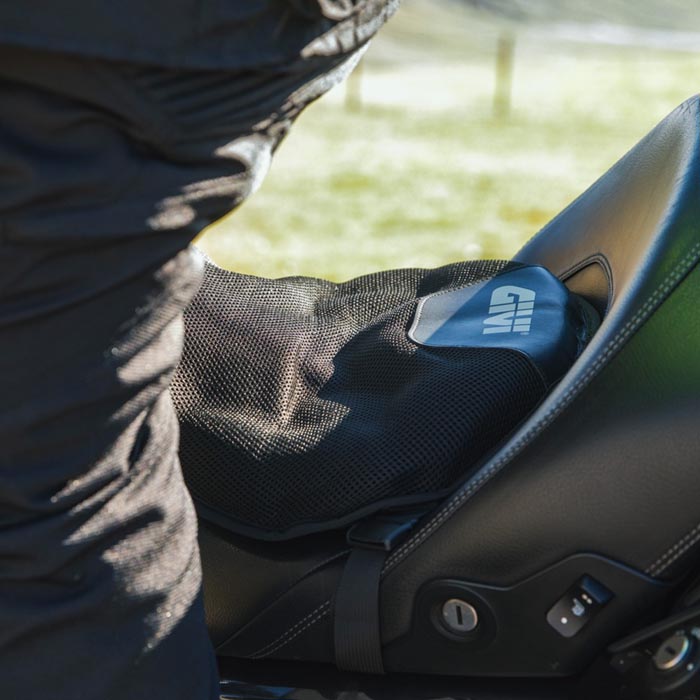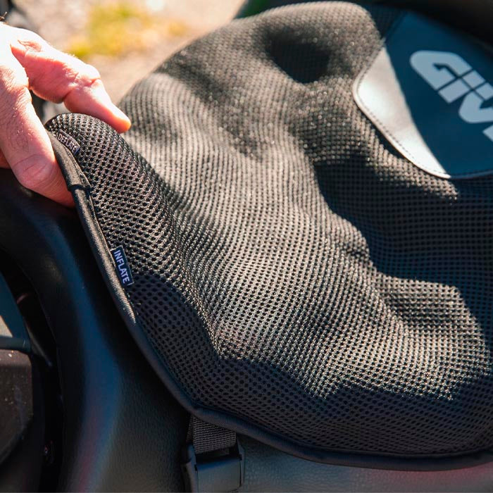 El cojín de asiento de aire universal de GIVI garantiza una conducción más flexible y cómoda, ya que reduce la carga en la espalda y en los glúteos, aumentando el confort durante los viajes en moto. El suave interior hinchable, realizado con TPU, está revestido en suave tejido transpirable de color negro.