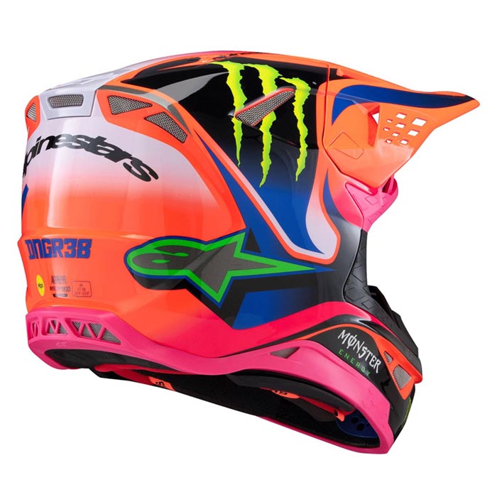 Casco Alpinestars S-M10 Deegan Naranja Fluor / Violeta / Rosa Fluor. El modelo S-M10 es el casco de gama alta de uso off-road de la marca Alpinestars. Cuenta con los últimos avances en tecnología ofreciendo un excelente rendimiento y protección al piloto, su diseño con un perfil suave y aerodinámico lo hace atractivo y diferente al resto. La curvatura de la superficie reduce la fricción en caso de impacto y permite la deflexión y transferencia de energía para proteger la cabeza del piloto. Destaca por ofrecer una protección extremadamente eficaz gracias a una construcción de la calota en distintas capas multicompuesto, con 4 tamaños de calota y hasta 6 tallas para un ajuste personalizado y seguro junto al forro interior EPS de 4 densidades ofrecen la mayor protección y absorción contra impactos. Incorpora la tecnología MIPS y sistemas de seguridad como A-Heat Fitment y el sistema de liberación rápida ERS del visor.