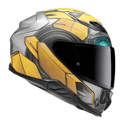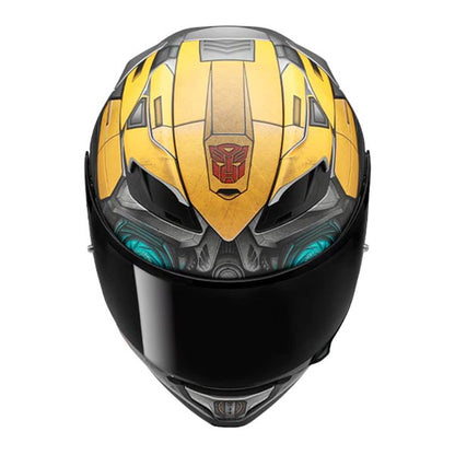 Casco HJC F71 Bumblebee Hasbro MC3SF. Casco integral con un diseño aerodinámico para un máximo rendimiento a altas velocidades. Fabricado en fibra de vidrio, es muy ligero y ofrece gran comodidad. Amplia pantalla mejorada con Dual Lock System. El sistema de ventilación está formado por 3 entradas de aire en la parte delantera y 2 salidas en la parte trasera. Incorpora kit de emergencia para una mejor extracción del casco en caso de accidente. Predisposición para instalar Pinlock® e intercomunicador SMART HJC (no incluido). Compatible con el uso de gafas. Cierre de doble hebilla.