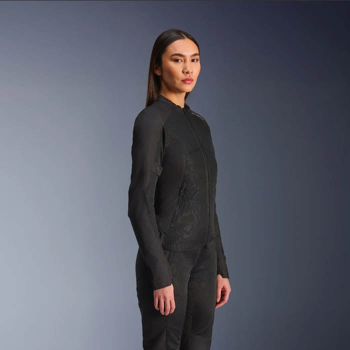 Chaqueta Alpinestars Stella C-1 Air Lady Negro. Chaqueta touring para mujer con un diseño versátil y ligero que aporta altos niveles de comodidad durante épocas calurosas. Está confeccionada en tejido de poliéster 450D de alta resistencia y cuenta con amplios paneles de malla ventilada en la parte delantera y trasera que garantizan la máxima aireación. Incorpora protecciones Nucleon Flex Plus de Nivel 1 en codos y hombros para una adecuada protección en caso de caída, además, dispone de varias zonas regulables para un óptimo ajuste en cada cuerpo. Cierre mediante cremallera delantera.