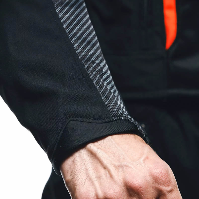 Chaqueta Dainese Air Frame 3 Tex Negro / Negro / Rojo-Fluor. Chaqueta de uso sport ideal para verano. Confeccionada con malla transpirable y tejido QuickDry, incorpora un forro interior desmontable cortaviento que permite mayor confort. Dispone de protecciones desmontables compuestas para una mejor protección y un bolsillo con predisposición para montar protector dorsal (no incluido). Cremallera de unión chaqueta-pantalón.